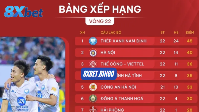 Người hâm mộ bóng đá Việt không thể bỏ qua giải V-League. Tại 8xbet, bạn sẽ được cập nhật vị trí các CLB trong nước, từ đó cổ vũ đội bóng yêu thích một cách cuồng nhiệt.
